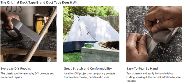 Available in a wide variety of strengths and technologies, Duck Tape Brand duct tape is relied upon as a trusted, must-have tool for just about any application. Because of its strength and adhesive properties, you can use All-Purpose Duck Tape for almost any job, including everyday household and auto repairs--anywhere a flexible and weather-proof bond is needed. All-Purpose Duck Tape has a thick, heavy-duty adhesive applied to a waterproof cloth backing for extra durability and to resist delamination in direct sunlight.