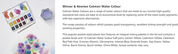 Winsor & Newton Cotman Water Colors are a range of water colors that are made to our normal high quality standards but costs are kept to an economical level by replacing some of the more costly pigments with less expensive alternatives. Each color has good transparency, excellent tinting strength and good working properties. The Cotman Painting PLUS set is part of our pioneering Cotman PLUS range which offers a selection of innovative and modern water color sets for all water color artists. This stylish set is comprehensive and practical in size, making it suitable for studio or outdoor painting. This Cotman Pocket PLUS set contains: 24 assorted Cotman Water Color half pans and a Cotman series 111 No. 3 brush. Typical of all PLUS sets, the Painting PLUS is both practical and versatile. It boasts substantial mixing surfaces including a removable clip on palette which can be clipped on either side of the set for extending mixing and a second internal palette which can be used inside or outside the set on a flat surface. The inside of the lid can also be used for extra mixing when other palettes are removed.