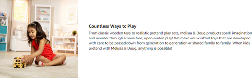 From classic wooden toys to crafts, pretend play, and games, Melissa & Doug products provide a launch pad to ignite imagination and a sense of wonder in all children so they can discover themselves, their passions, and their purpose.Since the company’s founding more than 25 years ago, Melissa & Doug has consistently delivered innovative products that inspire open-ended thinking, encourage kids to see new possibilities, and offer Countless Ways to Play. It’s part of a bigger vision to Take Back Childhood. Because by giving children a true childhood with the space and freedom to explore their world, we give them a path to realizing their full potential!