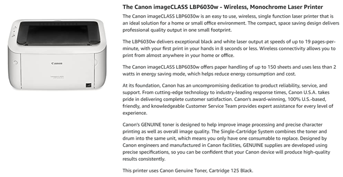 - FAST PRINT SPEEDS: Print up to 19 pages per minute.Print from almost anywhere in your office with wireless connectivityThe single cartridge system combines the toner and drum into one unit, making cartridge replacement simpleIn The Box : imageCLASS LBP6030w product, Starter Cartridge 125, Power Cord, USB Cable, User Manual, User Software CD-ROM, Warranty Card