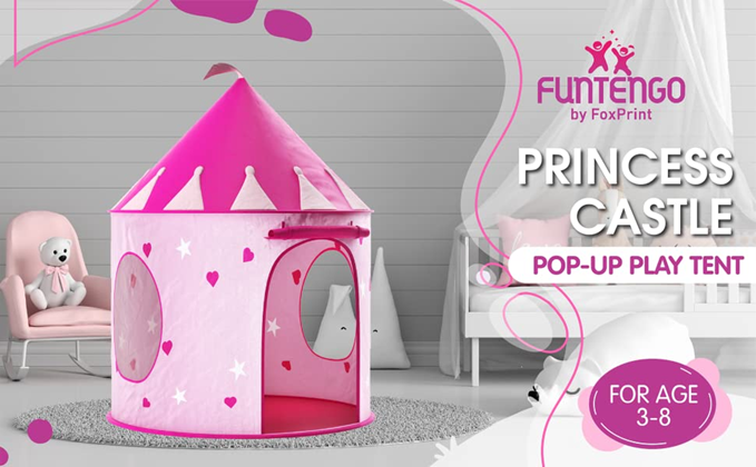 This large princess tent comes with a crawl in entrance with a roll up door. Suitable for ages 3 years +. Dimensions of item: 41.5” x 41.5” x 54” and is made out of 100% polyester taffeta. Features: minimal assembly - pop-up role play tent for instant play folds compactly for easy storage for ages 2 years and over - space for 2-3 kids portable and convenient to carry provides comfortable shelter for outdoor trips colorful and kid-friendly design includes sturdy Shock-Corded – fiberglass poles no assembly or accessories required to fix this tent two side windows for ventilations includes a carrying bag The poles are inserted from the bottom of the tent into concealed sleeves making them hidden and untouchable while in use for maximum safety.