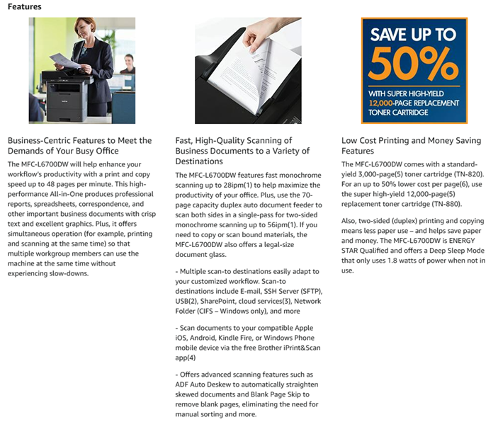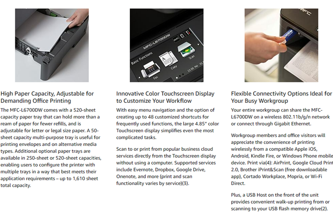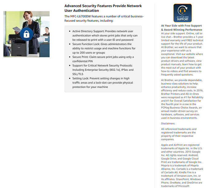 The Brother MFC-L6700DW Business Laser All-in-One is also Amazon Dash Replenishment enabled, which means that you never have to run out of toner when you activate this automatic fulfillment system. This Brother all-in-one is backed by a one-year limited warranty and free at-your-side support for the life of your product, featuring online, phone, or live chat assistance.