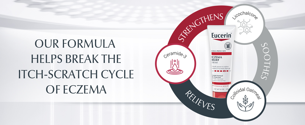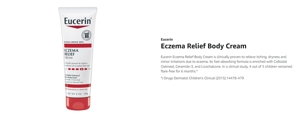 Eucerin Eczema Relief Body Cream is a clinically proven moisturizing formula that relieves and fortifies dry, itchy, eczema-prone skin. This fast-absorbing skin cream for eczema is formulated with colloidal oatmeal (a skin protectant), Ceramide-3 to lock in moisture, and Licorice Root Extract to help soothe irritated skin. This eczema cream is fragrance free and steroid free, and delivers 24 hour hydration. Eucerin Eczema Relief Body Cream is gentle enough for everyday use, and is appropriate for use on adults, children and babies 3 months and older. In a clinical study, with daily use, 4 out of 5 children remained flare-free for 6 months (1). For Eczema flare-ups, use Eucerin Eczema Relief Flare-Up Treatment Cream. Eucerin is a dermatologist-recommended skin care brand that is based on an uncompromising approach to science. With skin care products designed to restore and sustain healthy-looking skin, families everywhere look to Eucerin to enhance outer beauty and self-confidence. (1) J Drugs Dermatol Children’s Clinical (2015);14478-479.