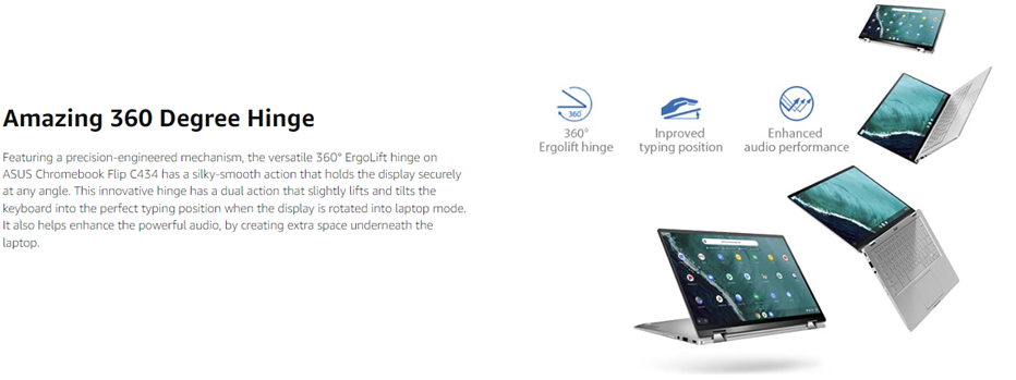 Introducing the all-new Flagship ASUS Chromebook Flip C434, a Chromebook featuring a durable 360-degree hinge, 14 inch display, 4-way NanoEdge narrow bezel, all metal finish, and USB Type-C/Type-A. Experience an ultrabook spec Chromebook that has the power and flexibility to get everything done.