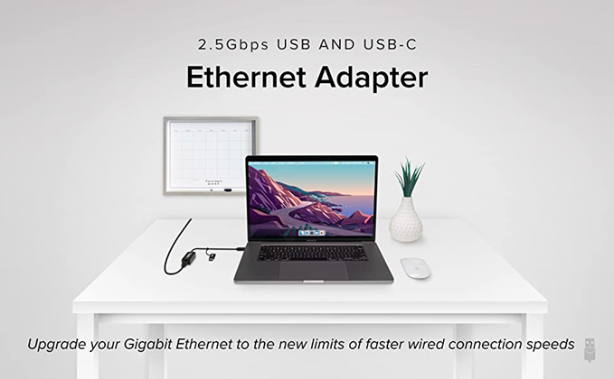The Plugable 2.5Gbps USB to Ethernet Adapter (USBC-E2500) is for users looking to move beyond Gigabit Ethernet speeds. With USBC-E2500, you can leverage existing Cat 5e Ethernet cables and use less-costly switches to more than double the performance of your local network, compared to traditional Gigabit Ethernet. The adapter comes with a Hybrid 2-in1 connection that converts from USB-C to USB-A, so you always have the right connection.