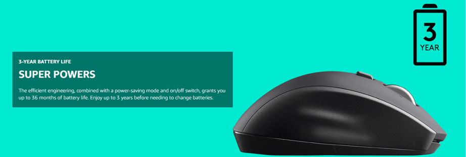 Logitech Wireless Mouse Marathon M705 lets you power on... and on. It uses far less power than comparable wireless mice from other companies, so you'll go up to three full years between battery changes.* And it uses a tiny wireless receiver that stays plugged in to your computer, so your mouse is ready to go-whenever, wherever, and for as long as it takes. Plus, hyper-fast scrolling means you'll fly through long documents to find what you need in a flash. Advanced Optical Tracking means you'll get smooth, responsive cursor control. And the sculpted, right-hand shape means you'll be as comfortable finishing up as you were getting started.