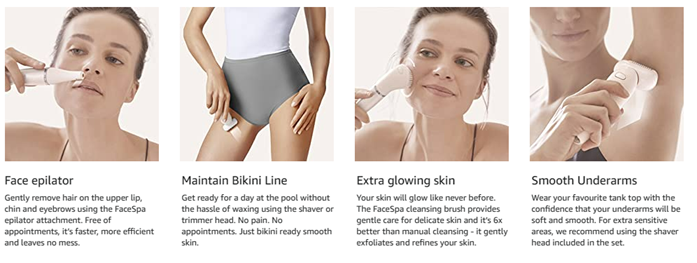 - ALL-IN-ONE: deluxe hair removal beauty set to shave, trim, epilate, and massage with interchangeable heads, plus FaceSpa device for facial epilation and cleansing
