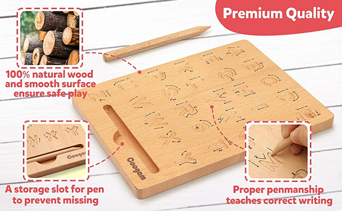 - Double-sided Design: The wooden letters tracing board is double-sided. It has upper case letters on one side and lower case on the other. Each alphabet has directional arrows to help the proper order and direction of the strokes. The child can see where they should start each line and the direction.