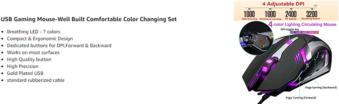 - 3 level adajustable mouse sensitivity DPI: 1000/1600/2400/3200 DPI