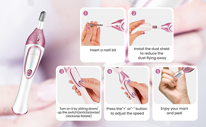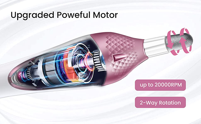 ★【4 Speed Settings Up to 20000RPM】 Electric nail drill designed with four adjustable speeds and support Forward/ Reverse direction (Speed 1: 5000RPM ; Speed 2: 10000RPM ; Speed 3: 15000RPM ; Speed 4: 20000RPM), which makes this electric nail file easier to polish your nails. Powerful enough for giving you a great precise nail grinding effect and flawless salon nails meanwhile there is no need to worry about hurting your nails.