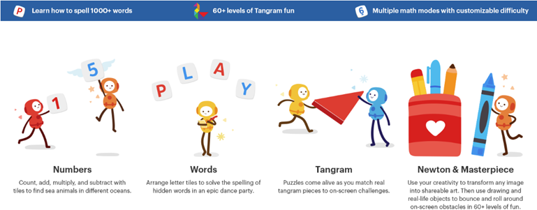 - TEACHING: Arrange over 100+ puzzle designs/pieces to match on-screen shapes (Tangram), solve creative physics puzzles by drawing lines or placing items in front of the screen (Newton), learn to draw anything with creative drawing skills (Masterpiece), add, count, subtract & multiply tiles to pop the number bubbles solving math equations (Numbers), learn spelling & vocabulary with on-screen images & skill level selection (Words).