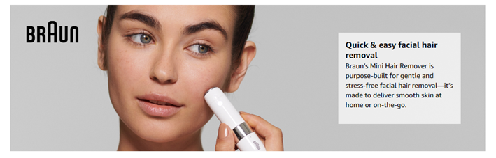 An elegantly designed, mini-sized electric facial hair remover for women, delivering fast and gentle hair removal results. The Braun Mini Hair Remover cuts hair close to skin level, leaving your face smooth, consistent and free of peach fuzz. Quick and gentle hair removal: whenever, wherever.Box includes: 1 X Mini Hair Remover1 X White Cap1 X Cleaning Brush1 X AA Battery