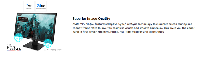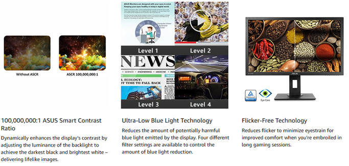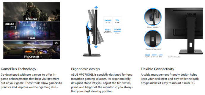 The 34” VP348QGL delivers an immersive Ultra wide gaming experience with HDR-10 support and adaptive Sync/free Sync for tear-free game play. Shadow boost enhances Details in dark areas, making spotting hidden enemies easier. Asus-exclusive eye Care technology helps to reduce eyestrain and ailments with flicker-free backlighting and blue light filters.