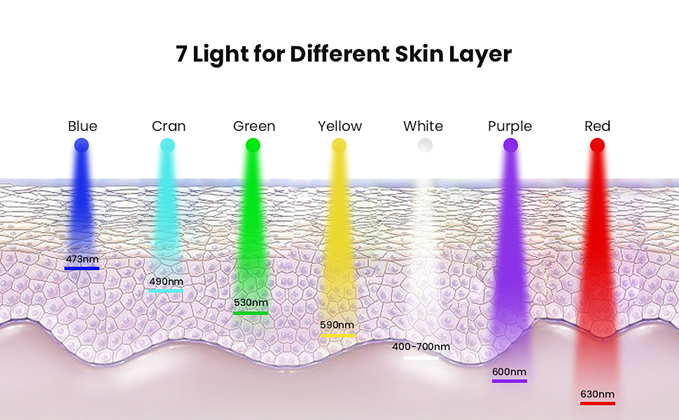 【LED Wavelength Skin Care】: The basic wavelengths are Blue 473nm, Green 530nm, and Red 630nm, which will yield 4 combo colorful light wavelengths. Different light wavelengths will solve various skin problems. Use of LED light therapy Frequently, your skin will be tender and smooth as a baby's skin.
