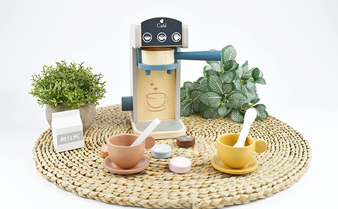 - Super cute wooden play kitchen accessories: 13 pieces in all! This kids wooden toys including 1 Coffee machine 1 Filter 2 Cups 2 Saucer 2 Spoons 1 Milk 4 Coffee pods.