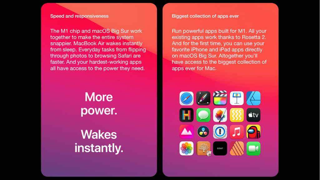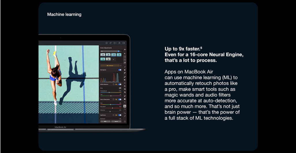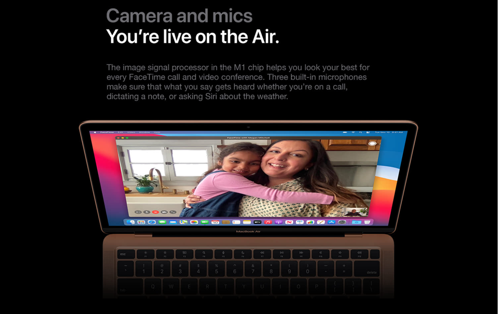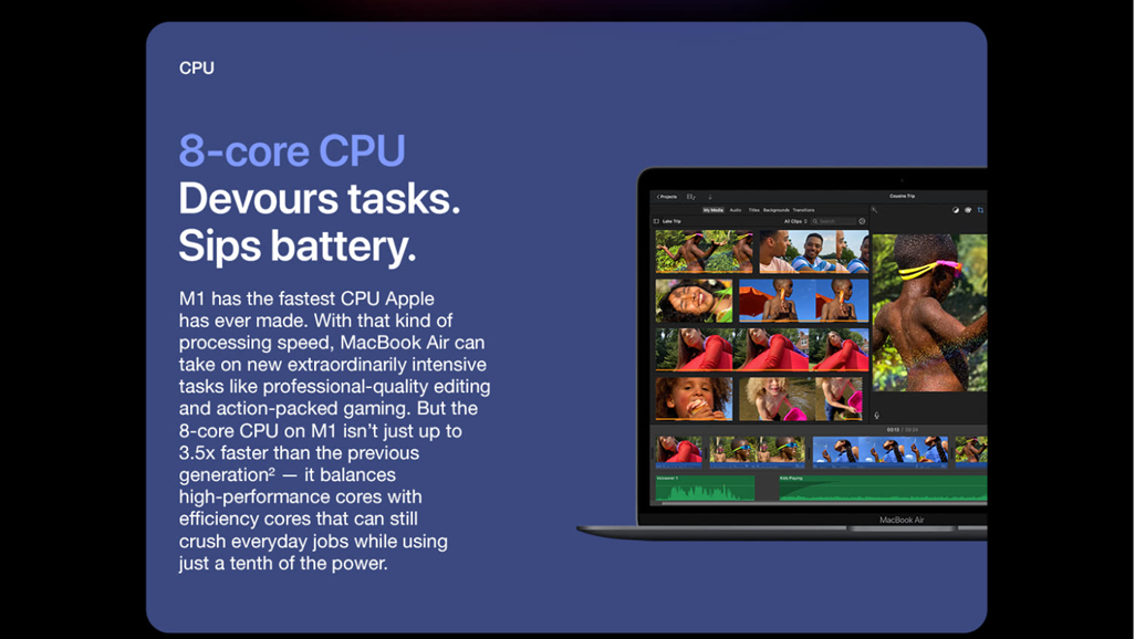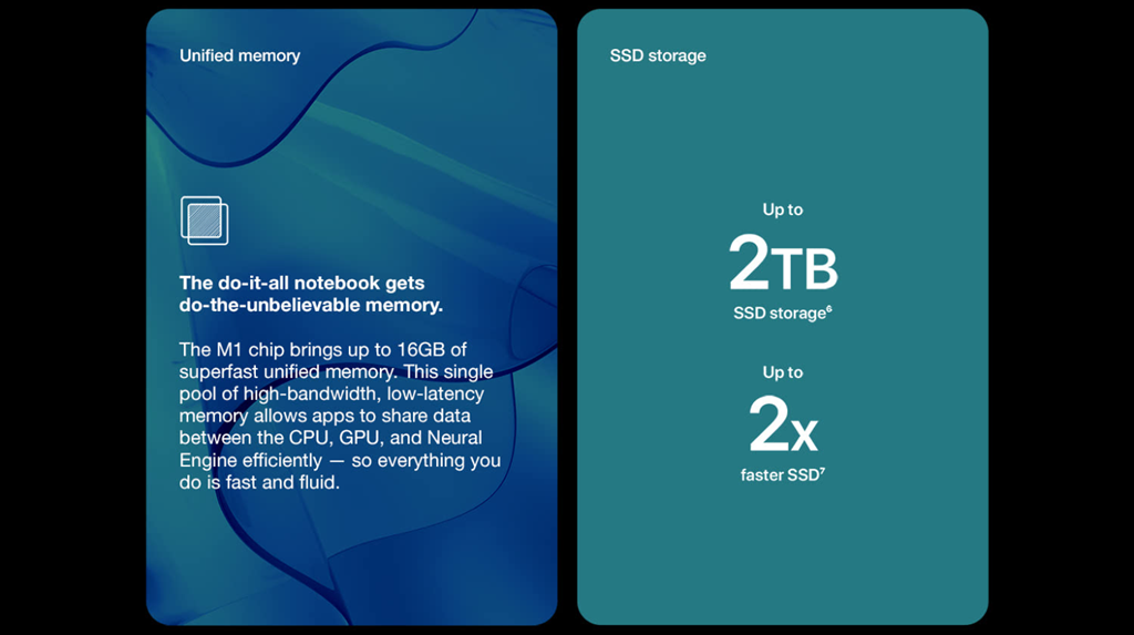 Processor | System on Chip (SoC) Apple M1 chip; 8-core CPU with 4 performance cores and 4 efficiency cores; 16-core Neural Engine |