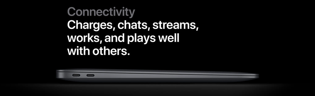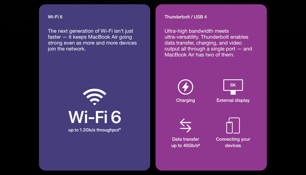 Charging and Expansion | Two Thunderbolt / USB 4 ports with support for: Charging, DisplayPort, Thunderbolt 3 (up to 40 Gbps), USB 3.1 Gen 2 (up to 10 Gbps) |
