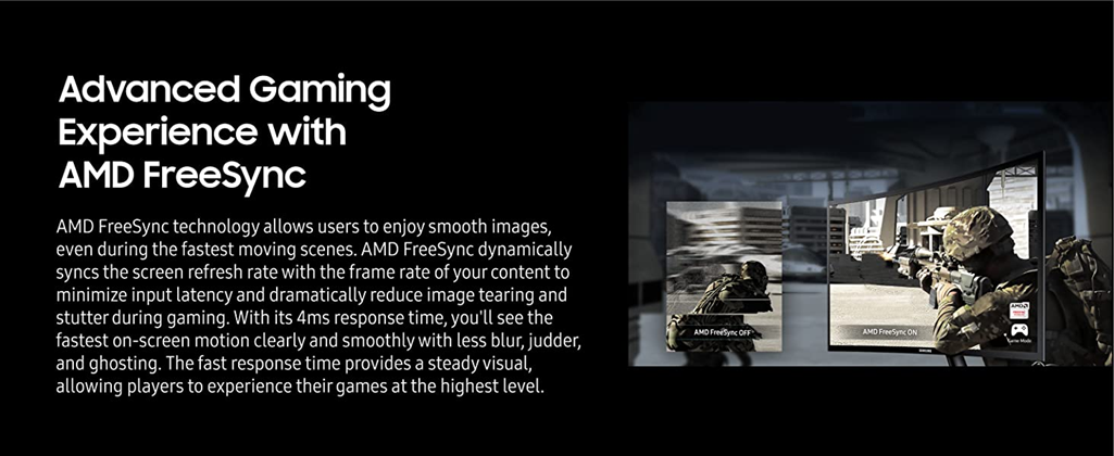 - ADVANCED GAMING w/ AMD FREESYNC: This technology allows users to enjoy smooth images, even during the fastest moving scenes; It minimizes input latency, dramatically reduces image tearing and stutter