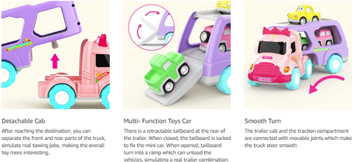 - ?【Inertial Double Layer Carrier Truck】--- Just push the big trailer truck forward and get auto driving. It will carry four mini vehicles and set off ! pull back the mini vehicles for a certain distance and let go, the car will automatically move forward and gradually accelerate. You can change direction or separate the truck cab from the trailer through the movable towing assembly. The tailgate can be locked for driving or lowered for unloading mini-vehicle.
