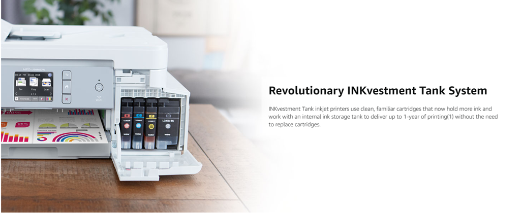 The Brother MFCJ995DW Investment Tank color inkjet all-in-one printer with tank technology is the optimal choice for your home or small office needs. It features reengineered Investment Tank cartridges along with an internal ink storage tank that delivers uninterrupted printing for up to 1-year without the need to purchase ink(1). Business-capable features include mobile device printing(3), Near Field Communication (NFC) print and scan(4), and easy onscreen navigation using the 2. 7" color touchscreen Brother Investment Tank color inkjet all-in-one printers help solve two major printing challenges -unexpectedly running out of ink and having to replace ink soon after purchasing the printer. Brother Investment Tank all-in-ones help take the guesswork out of when to replace ink by using the Brother intelligent Page Gauge(2), a visual, numerical way to know the amount of ink you've used and the amount you have remaining. No more running out of ink in the middle of an important or time-sensitive print job. Investment Tank models monitor actual ink usage and display your estimated remaining page counts to give you increased visibility, so you can print with confidence and virtually without interruption. (1)Based on average monthly print volumes of approximately 150 pages at 60% black pages / 40% color pages in accordance with ISO/IEC 24711 using 4 cartridges provided in-box. For more page yield information, see manufacturer's website. (2)Page Gauge is an estimate for informational purposes only. For actual cartridge yield information refer to manufacturer's website. (3)Requires connection to a wireless network. (4)The mobile device must have NFC capability and run Android OS 4. 4 or later. (5) Based on MSRP of LC3035 black and color ink cartridges and approximate page yield in accordance with ISO/IEC 24711. For more page yield information, see manufacturer's website. (6)Requires an Internet connection and an account with desired service. (7)Requires internet connection. (8)Reprinted from Puma with permission. Copyright 2017 Ziff Davis, All Rights Reserved. (9)Based on average monthly print volumes of approximately 300 pages (70% black pages / 30% color pages) and approximate page yield in accordance with ISO/IEC 24711 using 12 cartridges provided. (9) Based on average monthly print volumes of approximately 300 pages (70% black pages / 30% color pages) and approximate page yield in accordance with ISO/IEC 24711 using 12 cartridges provided. (10)Based on average monthly print volumes of approximately 300 pages at 60% black pages / 40% color pages in accordance with ISO/IEC 24711 using 4 cartridges provided in-box. For more page yield information, see manufacturer's website. (11) Based on ISO/IEC 24734 (after first set of ISO test pages). For inkjet print speed methodology, please visit manufacturer’s website. (12) Approximate page yields in accordance with ISO/IEC 24711. Operating Temperature: 50-95° F.