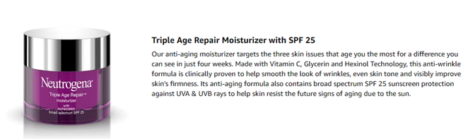 - 1.7-ounce jar of Neutrogena Triple Age Repair Face Moisturizer with SPF 25 Sunscreen deeply moisturizes and targets three common skin issues that age you the most—wrinkles, uneven tone and firmness
