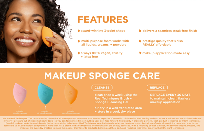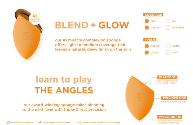 The Real Techniques Miracle Complexion Sponge flawlessly blends liquid and cream products with ease for a streak-free, luminous glow. Our #1 makeup blending sponge offers a natural, dewy finish, and its micro-fine pores help create a seamless base with light to medium coverage. Real Technique’s MCS works best with liquid and cream makeup products such as foundation, skin tints, and illuminators. This makeup sponge has RT's unique 3-point application technique that makes blending products seamless. First use the flat edge of the MCS to pack on product, then the precision tip to conceal, and finally, blend it all out with the rounded side. Use it damp for extra dewiness and let that inner glow shine through. The Miracle Complexion Sponge is easy to clean using our Real Techniques Brush + Sponge Cleansing Gel. It’s also 100% cruelty-free, vegan, and designed with revolutionary latex-free foam technology. Designed by makeup artists. Loved by millions. Real Techniques brings quality makeup brushes and tools used by professional makeup artists to the hands of beauty-obsessed customers around the world. Since 2011, we have been creating tools and accessories to help make the most of your favorite makeup. With a beauty community of over 5 million, Real Techniques® strives to inspire, educate, and empower our fans to make the most of their favorite products. Star products like the Miracle Complexion Sponge make blending foundation and concealer effortless while the Everyday Eye Kit – a handpicked selection of brushes - make a runway-ready smokey eye easily achievable. Real Techniques makes the craft of makeup artistry easy for anyone to understand, whether they’re striving for the best no-makeup look or creating the next viral TikTok video.