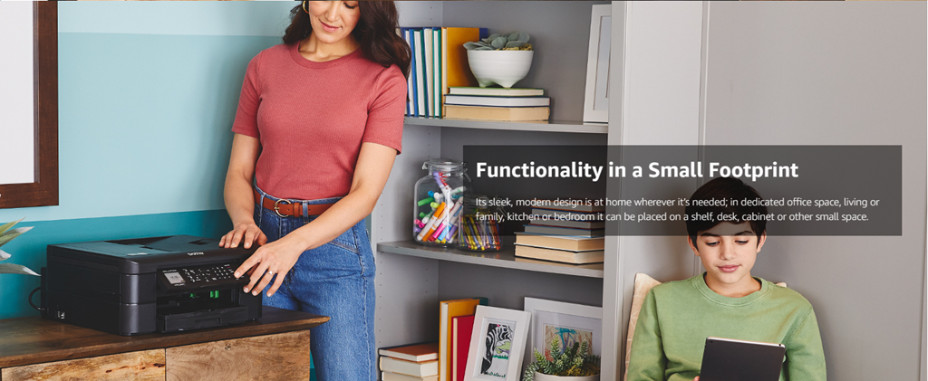 The Brother MFC-J1010DW color inkjet all-in-one printer is ideal for your home, home office or small office. Delivers robust features and business-centric functionality not found in similarly priced inkjet printers plus print up to 17 ppm for black and 9.5 ppm for color(5). Compact and economical, perfect for small spaces and budgets. Includes multiple connection options, including a built-in wireless(3) interface for sharing with multiple network users, Wi-Fi Direct(R), or connect locally via a USB interface. Delivering high quality, reliable printing, copying, scanning and faxing and enabling wireless printing from your desktop, laptop, smartphone or tablet(3). Use the 1.8-inch color display to navigate on screen menus. Featuring the Brother Mobile Connect(1) App, that gives you the freedom to print and manage your printer from virtually anywhere. The MFC-J1010DW also features the unique Brother Page Gauge(2) that estimates remaining page levels, so you always know how much ink you have left. Use the 20-page capacity automatic document feeder or the 150-sheet capacity adjustable paper tray for generous output without constant monitoring. Duplex printing helps save paper, while mobile device printing(3) and Cloud connectivity let you print-from and scan-to popular Cloud services(4) directly from the device. Has a 1-year limited warranty and free online, call, or live chat support for the life of the printer. Works with Alexa.(1) Requires wireless network connection; Brother Mobile Connect free app download not available in all countries.(2) Page Gauge is an estimate for informational purposes only. For actual cartridge yield information refer to manufacturer’s website.(3) Requires wireless network connection.(4) Requires Internet connection and account with desired service.(5) Based on ISO/IEC 24734 (after first set of ISO test pages). For inkjet print speed methodology, please visit manufacturer’s website.(6) All page yields are approximate and are calculated in accordance with ISO/IEC 24711; for additional page yield info, see manufacturer’s website.(7) Based on average monthly print volumes of approximately 100 pages at 60% black pages/40% color pages in accordance with ISO/IEC 24711 using 4 cartridges provided in-box. For additional page yield information, see manufacturer’s website.(8) Based on average monthly print volumes of approximately 150 pages at 60% black pages/40% color pages in accordance with ISO/IEC 24711 using 4 cartridges provided in-box. For additional page yield information, see manufacturer’s website.(9) Requires connection to a wireless network. AirPrint is a registered trademark of Apple Inc. Mopria® is a registered trademark or service mark of Mopria Alliance, Inc. in the United States and other countries. Unauthorized use is strictly prohibited. Wi-Fi Direct is a registered trademark of Wi-Fi Alliance®. Brother Mobile Connect and Brother iPrint&Scan free app download are not available in all countries.(10) The mobile device must have NFC capability and run Android OS 4.4 or later.Images are for illustrative purposes only. Specifications subject to change.