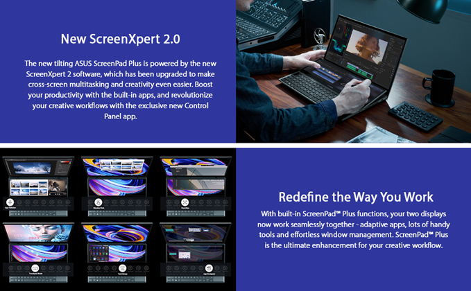 - Enhanced productivity: the tilting ScreenPad Plus – a secondary 14 inch 4K touchscreen that automatically tilts up for comfortable viewing - gives you endless ways to optimize your multitasking experience