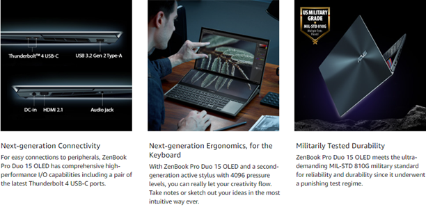 - Professional-grade performance: With a 12th Generation Intel Core i7 processor, 16 GB of RAM, 1 TB SSD, and NVIDIA GeForce RTX 3060 graphics, Zenbook Pro Duo 15 OLED is a true powerhouse