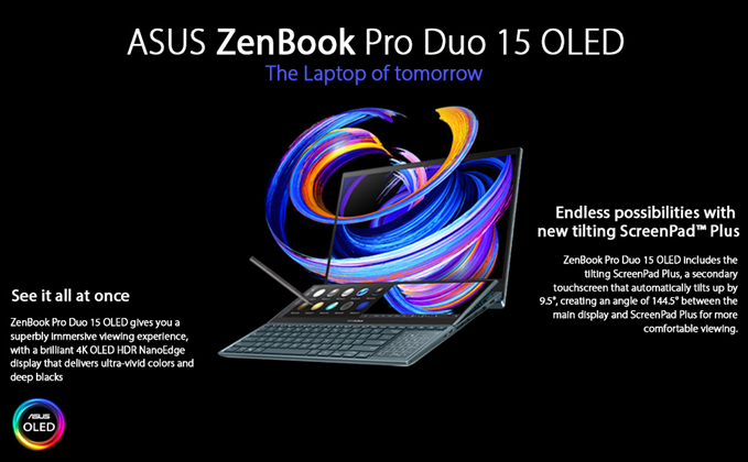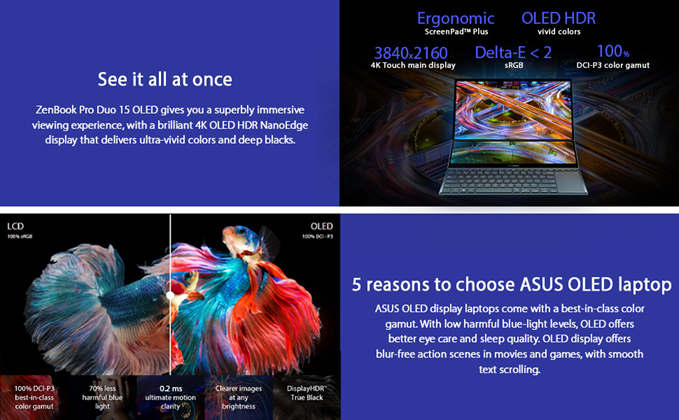 - Amazing visuals: this 15” touchscreen laptop has a 4K OLED HDR NanoEdge display. ASUS OLED laptop computers provide ultrasmooth visuals, professional-grade colors and better eye care.