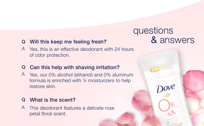 If self-care had a fragrance, what would it be? Our vote goes to delicate, floral scents. With Dove Advanced Care Rose Petals Antiperspirant Deodorant Stick, you can treat your skin and your senses, whenever you need it most. Enjoy the light, flowery scent of rose layered over sandalwood and velvety peach. Wondering how to care for underarm skin? This antiperspirant stick, which is enriched with our signature 1/4 moisturizers with natural oil, gives you noticeably soft skin. With a kind-to-skin formula that contains 0% alcohol (ethanol), it's a great antiperspirant deodorant for irritated underarms. And that's not all. This gentle, non-irritating deodorant stick keeps you protected from sweat and odor for up to 48 hours. Use Dove deodorant for women regularly and you can enjoy beautifully soft and comfortable underarms that stay dry all day long. For best results, apply this Dove antiperspirant deodorant to dry skin after showering and enjoy fresh, comfortably dry skin from morning to night. Dove is certified cruelty-free by PETA because we believe that real beauty is cruelty-free. We're on a mission to help women raise their self-esteem - because we believe beauty should be a source of confidence, not anxiety. Dove Antiperspirant Deodorants deliver effective underarm protection and are kind to skin, so women can be free of underarm inhibitions and live beautifully unselfconsciously.