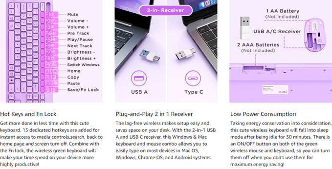 - Wireless convenience & 2-in-1 USB A/C Receiver -- Simply plug the receiver directly into your computer that only has USB A ports, or a Mac, MacBook or Chromebook that only has Type C ports, the pink wireless keyboard and mouse are ready to go 33ft of robust wireless freedom (NOTE: Please know that the C port receiver needs to be fully inserted into Mac's port to make it work)