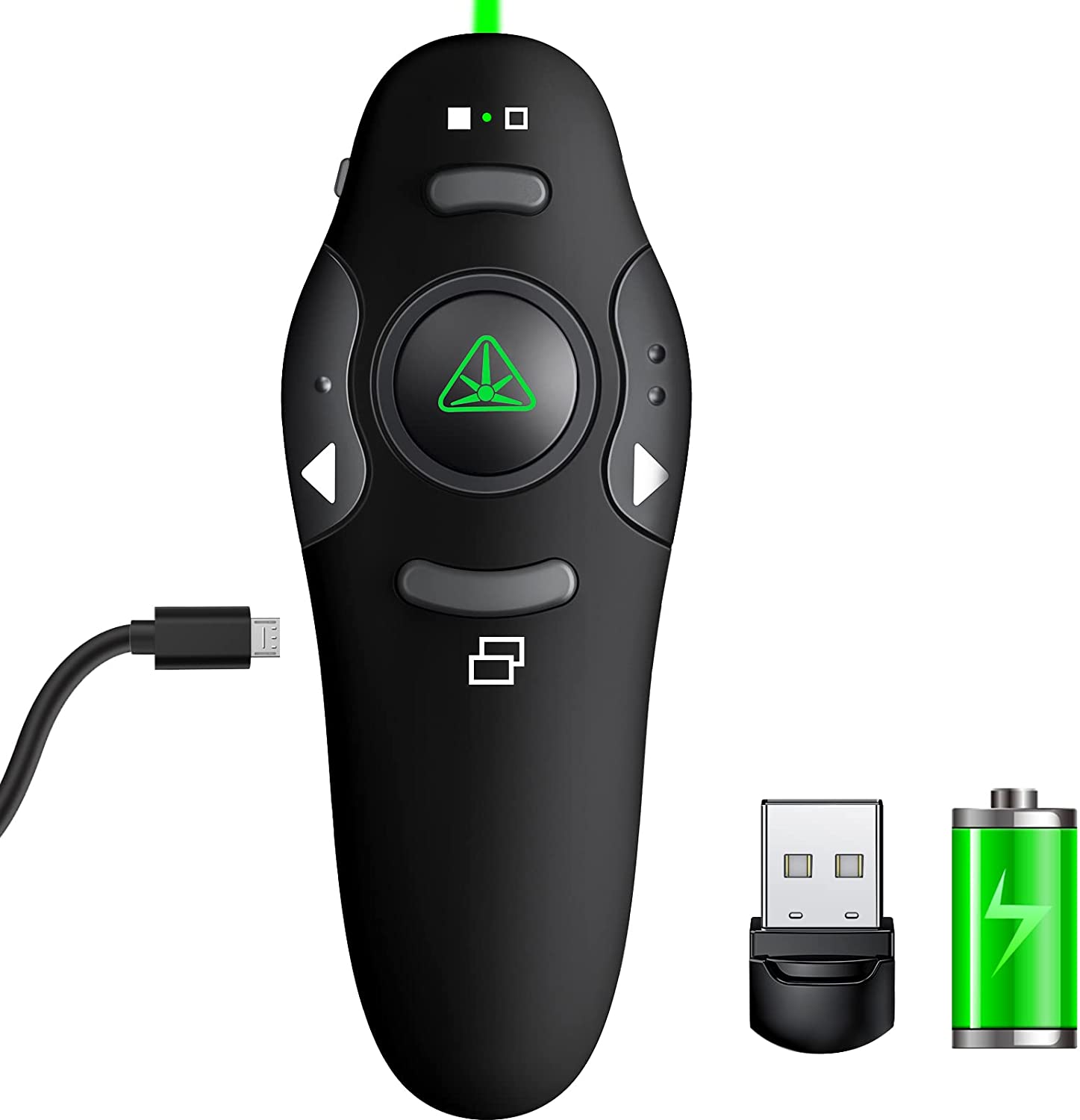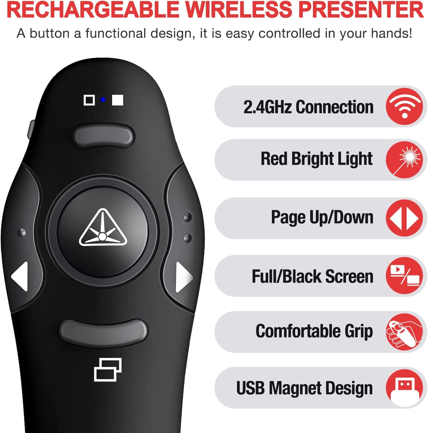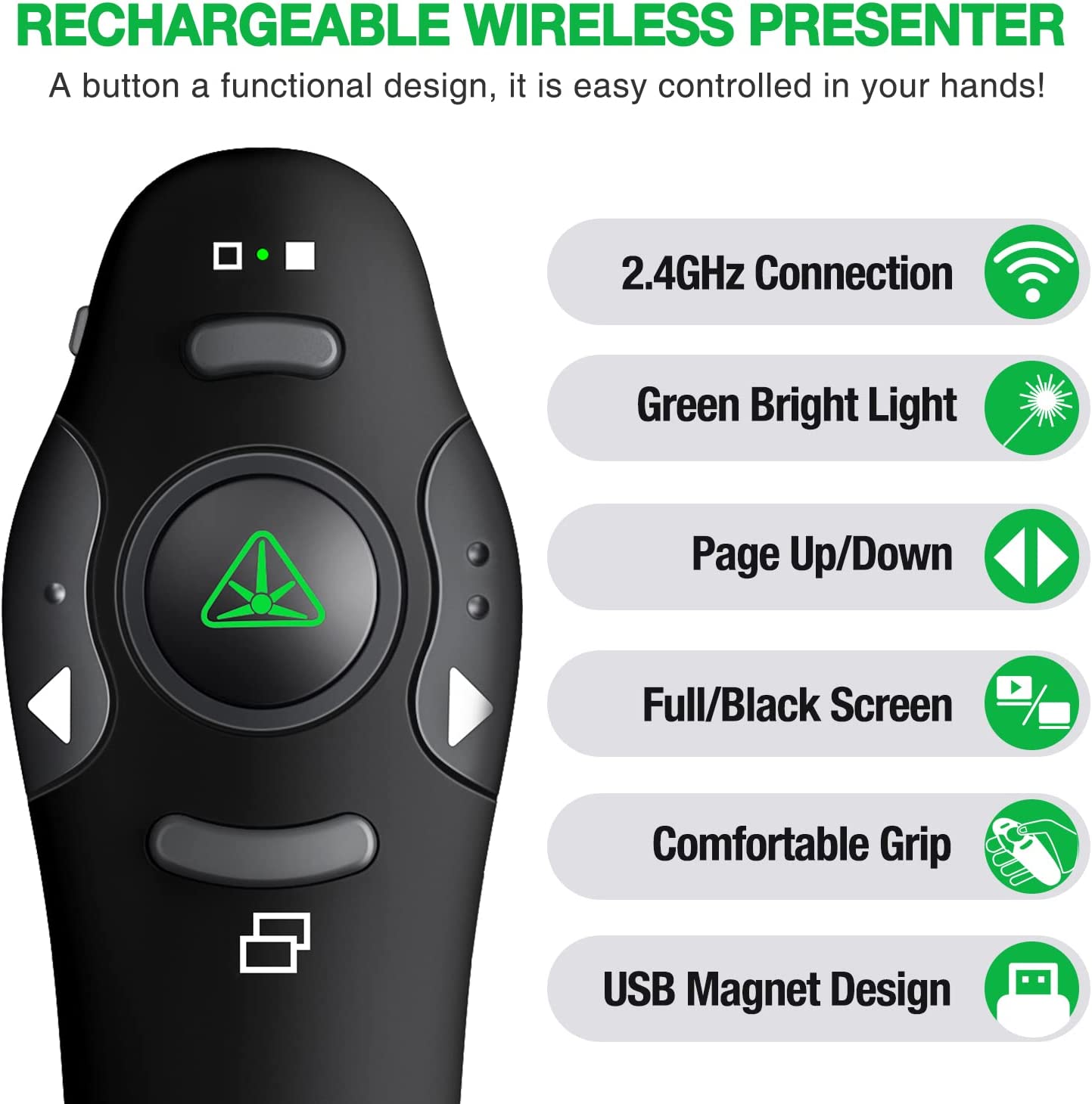 【RECHARGEABLE WIRELESS PRESENTER CONTROL】The slide clicker built-in 300mah battery, 1.5 hours of charging can be used for several weeks, there is a smart sleep mode, sliding the clicker will enter the sleep mode, not in use automatically shut down to save power. Essential presentation tools for the classroom or office.
