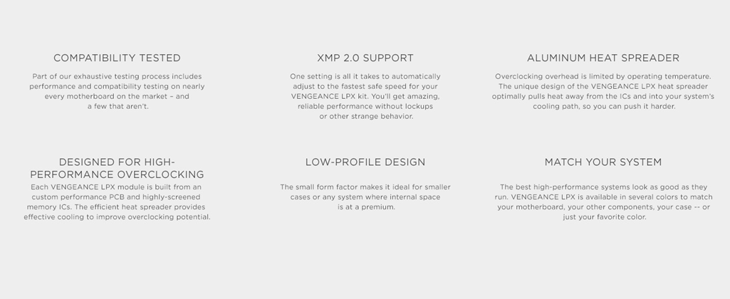 VENGEANCE LPX memory is designed for high-performance overclocking. The heatspreader is made of pure aluminum for faster heat dissipation, and the custom performance PCB helps manage heat and provides superior overclocking headroom. Each IC is individually screened for performance potential. The DDR4 form factor is optimised for the latest Intel and AMD DDR4 motherboards and offers higher frequencies, greater bandwidth, and lower power consumption than DDR3 modules. VENGEANCE LPX DDR4 modules are compatibility-tested across Intel DDR4 motherboards for reliably fast performance. They’re available in multiple colors to match your motherboard, your components, or just your style.