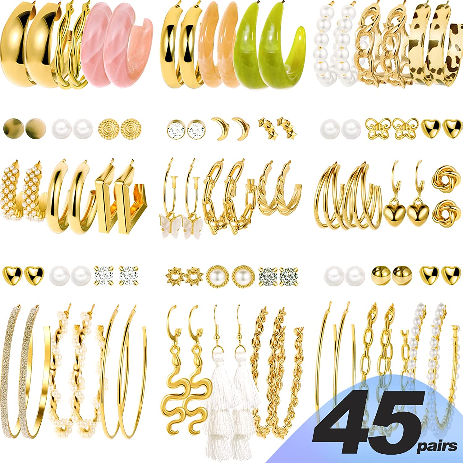 - Gold Earring Set 45 Pairs: The earrings set comes with 45 pairs of different gold earrings. All earrings are made of high quality alloy, free of lead and nickel, and hypoallergenic, mirror color-preserving gold plated, smooth and shiny, delicate texture, durable and not easy to fade, bringing you a better wearing experience!