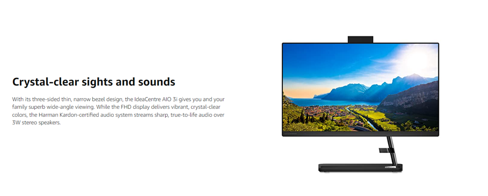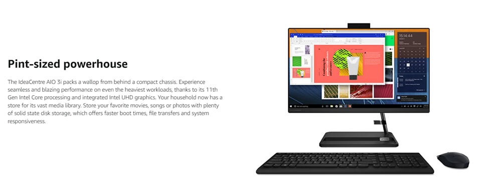 The IdeaCentre AIO 3i desktop computer is designed to perform and impress. This all-in-one computer is a pint-sized powerhouse, packing a wallop inside a compact chassis. Great things do come in the smallest packages, and housed in a sleek and compact frame, the Lenovo IdeaCentre AIO 3i delivers peak performance an 11th generation Intel® Core™ i3 processor, along with lightning-fast file transfer and boot times thanks to its 256GB SSD. Three-sided narrow bezels on the 22-inch FHD display and Harman®-certified stereo speakers make this the consummate family PC. It's great for personal productivity, working from home, or your child's schoolwork.Your household now has a store for its vast media library. Amass hundreds of movies and thousands of songs or videos with 256GB solid-state disk storage, which offers faster boot times, file transfers, and system responsiveness. Watch all of your favorites on the wide-angle full HD (1920 x 1080) touchscreen display, which also gives you more options for intuitive interaction with your computer - clicking and dragging files is easier than ever. This convenient AIO PC is made to make connecting simple, with a built-in webcam for videoconferencing and video chats that you can shut down for privacy. You'll also connect with wireless LAN (2x2 802.11 ac) and Bluetooth® combo card, plus multiple USB 2.0 and 3.2 ports, 1000 LAN, and HDMI™-out.