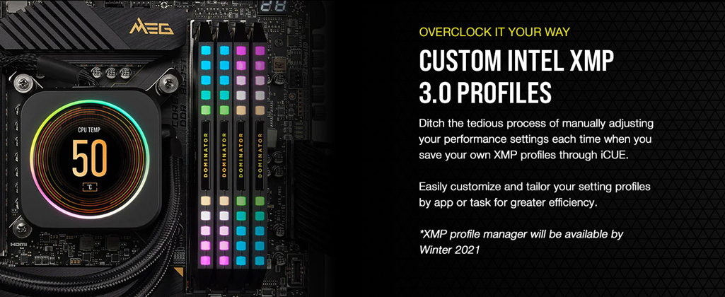 - Custom Intel XMP 3.0 Profiles: Customize and save your own XMP profiles via iCUE to tailor performance by app or task for greater efficiency.