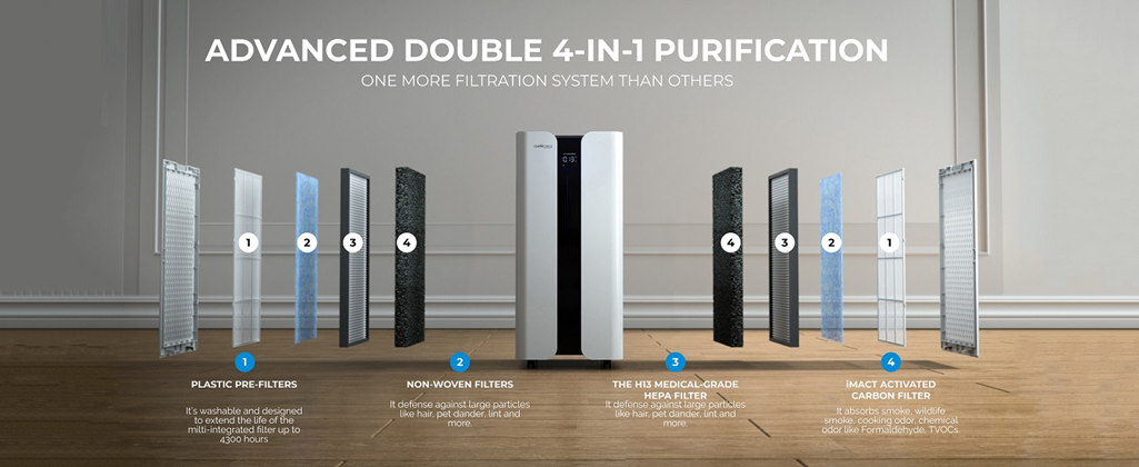 - <b>SUPERIOR PURIFICATION CAPACITY: </b>Filters up to 4650 sqft in 1 hour/ 2325 sqft in 30 minutes with a 1000 CADR for Extra large room coverage. Dual air intake and twin-turbo fans offer up to 2X4 layers of filtration through two plastic pre-filters and two multi-Integrated Filter Sets - combining non-woven fabrics filter, H13 Medical Grade HEPA filter, and activated carbon filter in one set.