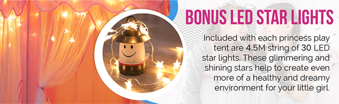 - BONUS LED STAR LIGHTS – Included with each princess play tent are an FCC certified 4.5M string of beautiful LED star lights (3 AA batteries not included). These glimmering and shining stars help to create even more of a healthy and dreamy environment and make the Perfect Princess Tent for Girls!