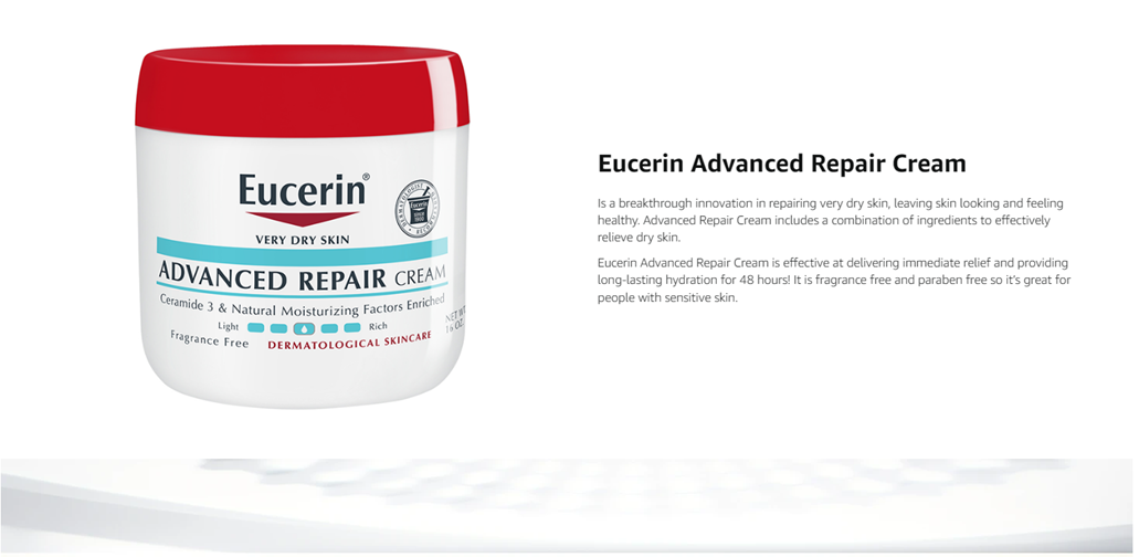 Fight dryness at its source with Eucerin Advanced Repair Body Cream. This Eucerin cream provides 48 hour moisture for skin that looks and feels healthy. Eucerin body cream for dry skin is formulated with ceramides to help strengthen the skin’s moisture barrier to lock in moisture. It is also formulated with Natural Moisturizing Factors, amino acids that are naturally found in the skin, to boost moisture and help prevent dryness. This Eucerin sensitive skin cream formula is lightweight and fast-absorbing to smooth, repair and hydrate dry skin. This Eucerin cream is fragrance free, dye free, paraben free, and is gentle enough for use as a daily skin repair cream. This body moisturizer can also be used as a hand cream or foot cream, and is effective as a very dry skin cream. To use, smooth this Eucerin dry skin cream onto your skin daily. For best results, apply after showering. Eucerin is a dermatologist-recommended skincare brand that is based on an uncompromising approach to science. With skin care products designed to restore and sustain healthy-looking skin, families everywhere look to Eucerin to enhance outer beauty and self-confidence.