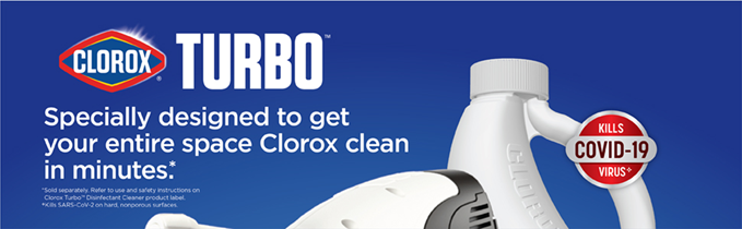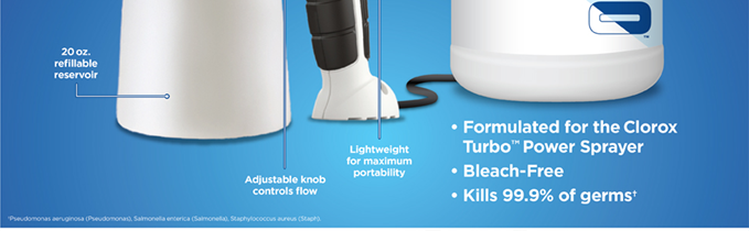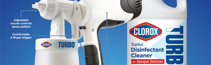 Get your entire space Clorox clean in minutes. The Clorox Turbo Power Sprayer is engineered to apply disinfectant to high-touch areas such as kitchens, gyms, restrooms, salons, clinics, locker rooms and offices quickly and efficiently. When used with the specially formulated Clorox Turbo Disinfectant Cleaner, all you need to do is spray theres no wiping required. Use this power sprayer to tackle small areas like salon stations or restaurant tables, or big areas like your entire facility at the end of the day. It boasts a nonstop corded performance for continuous and reliable power that doesnt fade, making it ideal for whole-facility jobs. Equipped with a precision mist nozzle with adjustable spray settings, allowing you to evenly cover high-touch surfaces with disinfectant. Features a 20-ounce removable tank thats easy to refill so you can get back to spraying more quickly. Designed for use with Clorox Turbo Disinfectant Cleaner (not included). The disinfectant cleaner kills 99.9% of germs, viruses and bacteria, including COVID-19*. It is a bleach-free formula that is safe to use on hard, non-porous surfaces such as like acrylic, chrome, glass, laminate, plastic, stainless steel, vinyl, and soft surfaces such linens, upholstery and mats. For all food contact surfaces, a water rinse is required. Refer to use and safety instructions on the Clorox Turbo Disinfectant Cleaner before using this product. Included: Power Sprayer, Operator's Manual, Quick Start Guide. Sold Separately: Extension cord, Clorox Turbo Disinfectant Cleaner Pseudomonas aeruginosa (Pseudomonas), Salmonella enterica (Salmonella), Staphylococcus aureus (Staph) Rhinovirus Type 14, Rhinovirus Type 39, Avian Influenza Virus (H5N1) *SARS-CoV-2 on hard, non-porous surfaces.