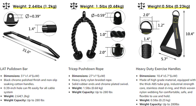 - ?【Three Deteachable Handles】We provide you with 3 detachable handles, allowing you to freely change the gym attachment you want; ① Tricep rope: used for triceps push down, Biceps flexion and multi-row movements. ②Honeycomb type handles: can exercise chest muscles by chest expansion and clamping, better non-slip to help you exercise more effectively. ③ LAT pull bar: used for pull-up/pull-down training, exercise arm wrist and forearm strength.