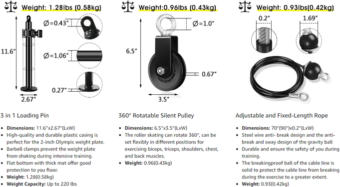 - ?【Professional & Premium Material】The upgraded loading pin is made of thicken steel, fitted with a 5cm widen detachable pipe sleeve to fit both Olympics and Standard weight plates, max weight loads up to 280 lb; the bottom increased sponge to ensure your floor from damage. 360° rota-table silent pulley, ensure quiet and stable of the pulley system operation; Comes with two sizes(70" & 90") high-level cable to meet your various exercise ways.