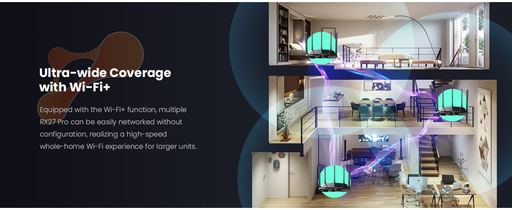 - Ultra-wide Coverage with Wi-Fi+:Equipped with the Wi-Fi+ function, multiple RX27 Pro can be easily networked without configuration, realizing a high-speed whole-home Wi-Fi experience for larger units.