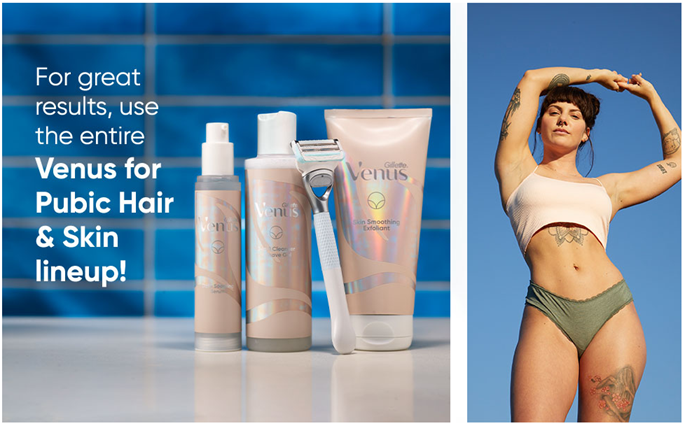 Venus's pubic hair and skin blades are specifically designed to help protect pubic skin from shave irritation. They have a patented irritation defense bar and optimally spaced blades that allow the blades to cut hair while barely touching the skin. Also, the razor refills come equipped with a precision Trimmer on the back of the blades to help with tricky areas.