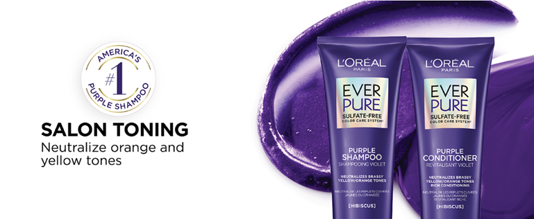 - L'Oreal Paris EverPure Sulfate Free Purple Shampoo and Conditioner provides color protection and corrects brassy blonde with yellow and orange tones