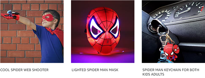 • DREAMING SUPERHERO PLAYSET FOR KIDS: 1PC Web Shooter with 3 toy launchers,1PC Led Mask,1PC Superhero Cape,1PC Felt Eye Mask,1PC Spider Toy Keychain for Backpack